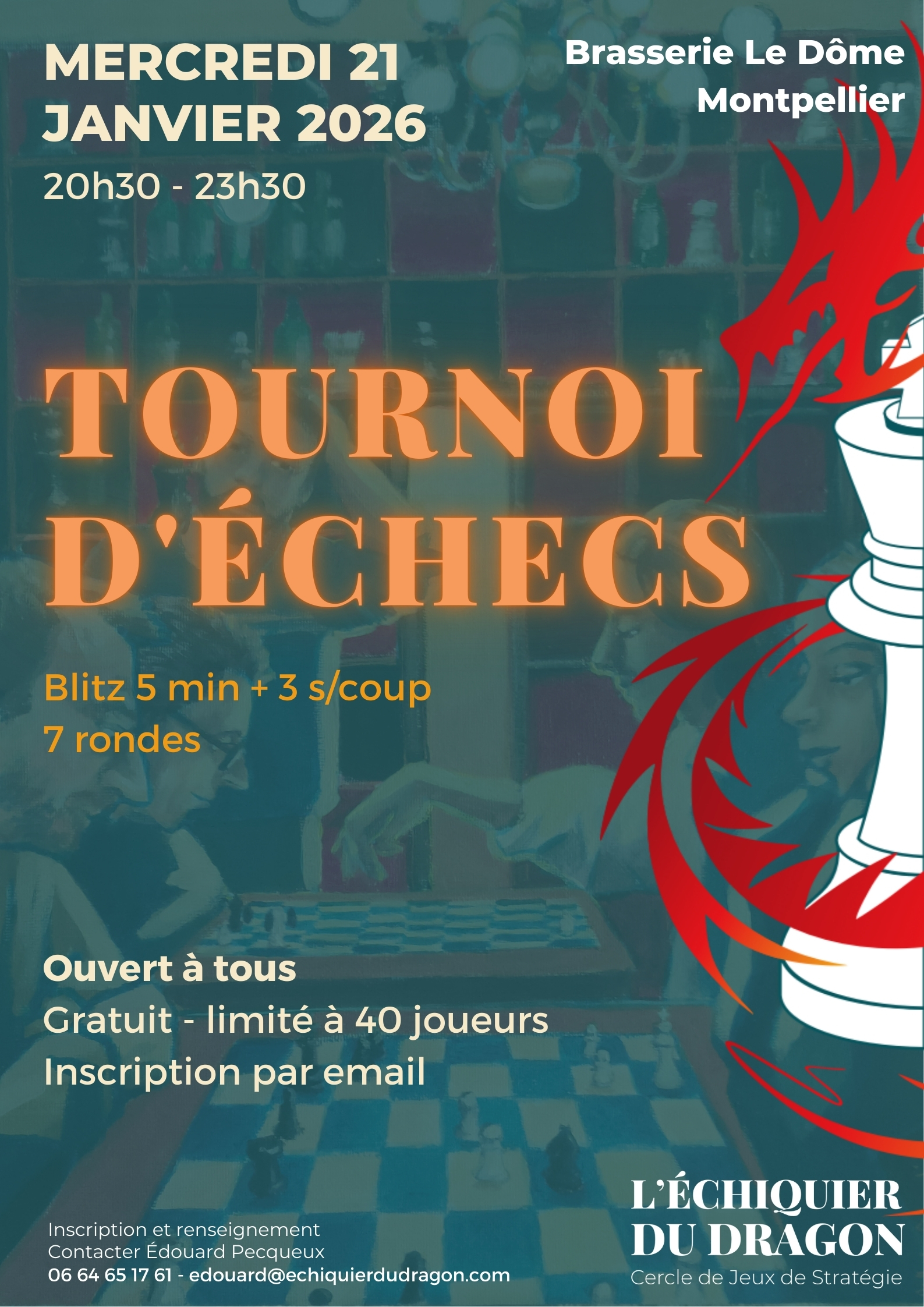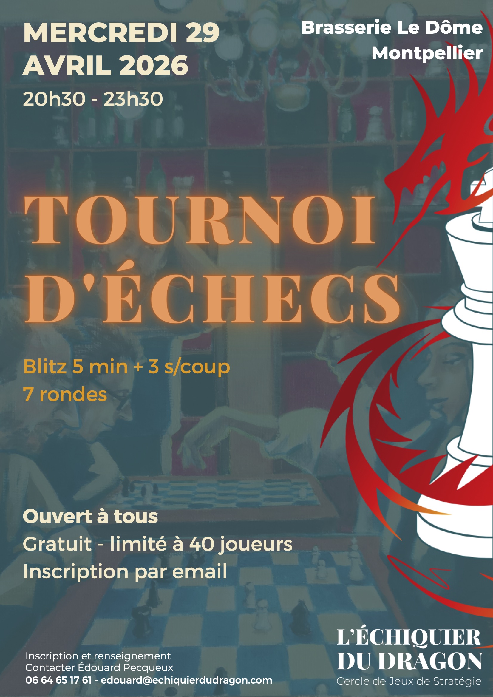 Tous les mercredi, l'Échiquier du dragon vous invite se retrouver pour jouer aux échecs de 21h à 23h au Dôme (avenue Georges Clemenceau 34000 MONTPELLIER)